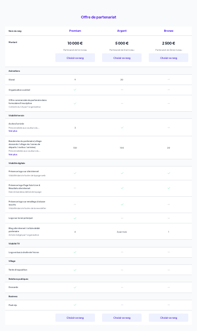 Une fois votre projet présenté, vous devez présenter ce que vous avez à offrir à vos partenaires et sous quelles conditions. Dans un tableau, détaillez les différentes offres de partenariats et leur montant ainsi que les contreparties qui leur sont associées.